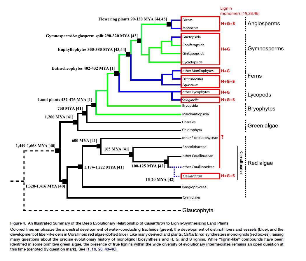 Land plants were thought to have evolved from green algae, not red algae, and lignin was thought to have been a later development that only came after the evolution of mosses, liverworts and hornworts. In the tree below, the species with red boxes around them contain lignin. The one at the very bottom is Calliarthron – a species of Red Algae that also contains jignin. It is separated by a vast distance in terms of its relationship to terrestrial plants.